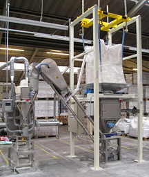 另一種是大袋開袋站是靠自身攜帶的起重設備將大袋(噸袋)吊裝到卸料機的機架上,不需用外界的幫助。